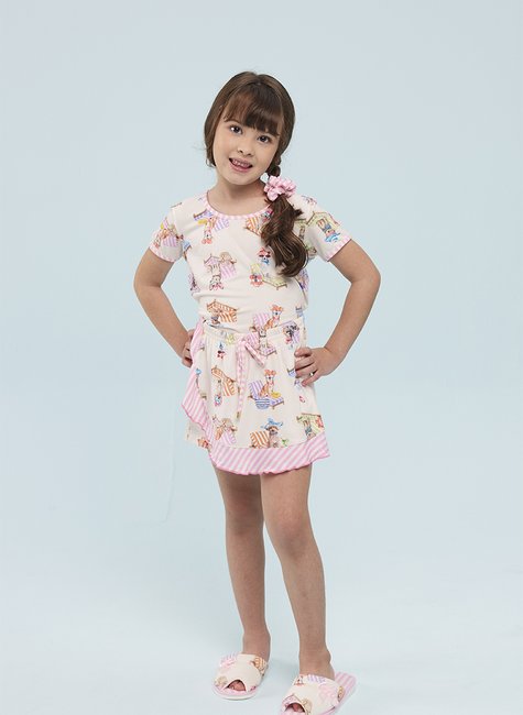 A estampa alegre e supercolorida é o destaque: um mix de tons vibrantes e divertidos que traz o clima de verão para o pijama, deixando cada peça cheia de vida e personalidade. O acabamento com viés rosa listrado dá um charme extra, enquanto a modelagem soltinha garante liberdade de movimentos para todas as idades.