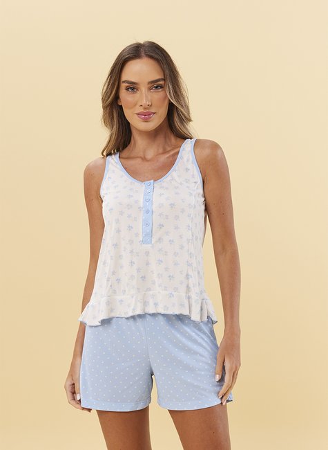 A blusa tem decote redondo com abotoamento funcional e babadinho na barra, que traz um toque feminino e romântico. O short com estampa de poá completa o visual com charme e praticidade.