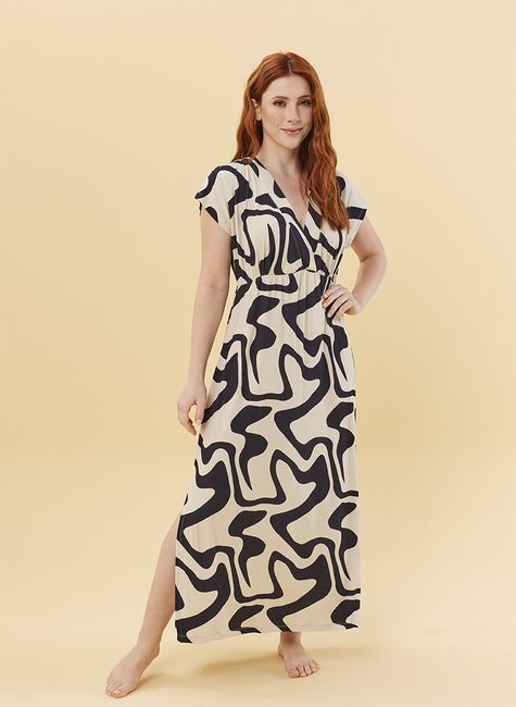 O modelo apresenta decote em V, mangas amplas e cintura levemente marcada, valorizando a silhueta sem perder o conforto. A estampa moderna em contraste traz um toque contemporâneo, enquanto o comprimento longo com fenda lateral adiciona charme e leveza à peça.