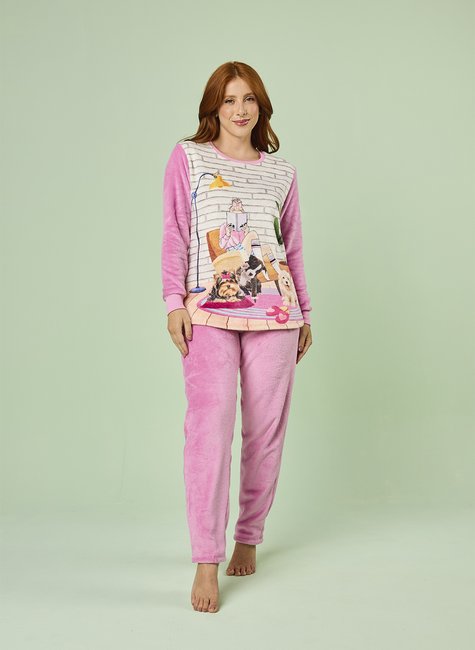 A blusa de manga longa traz uma estampa delicada e encantadora, que transmite uma sensação de tranquilidade e bem-estar, enquanto a calça lisa em fleece completa o conjunto com muito conforto.