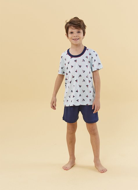 Nosso pijama pai e filho vem com camiseta estampada de veleiros e shorts lisos em tom azul-marinho, trazendo leveza e estilo para a hora do descanso.